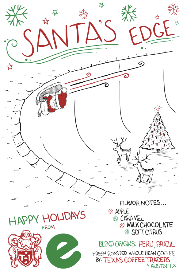Tis the season for good coffee ! I am excited to have these beans back in to say the least . . . Ever wonder how Santa can pull off what he does in just one night? . . ."Santa's Edge" is our sesonal coffee offering to keep you going during this festive time of year. The idea for this came about from a little talk I had with Tina from Empire. We sure do know a lot of people that like coffee, so we got together on this in hopes that we could cover a few of you. This coffee is very easy to drink, as it's a blend of beans with origins in Peru & Brazil. It's always exciting for us to be able to share a little of what we like, with you. I hope you enjoy it. Happy Holidays ! - joe
